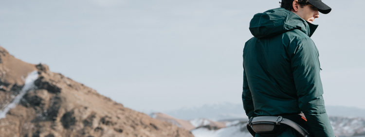 A man wearing a dark green technical jacket and a Hypershell exoskeleton stands on a rugged, mountainous ridge during spring.